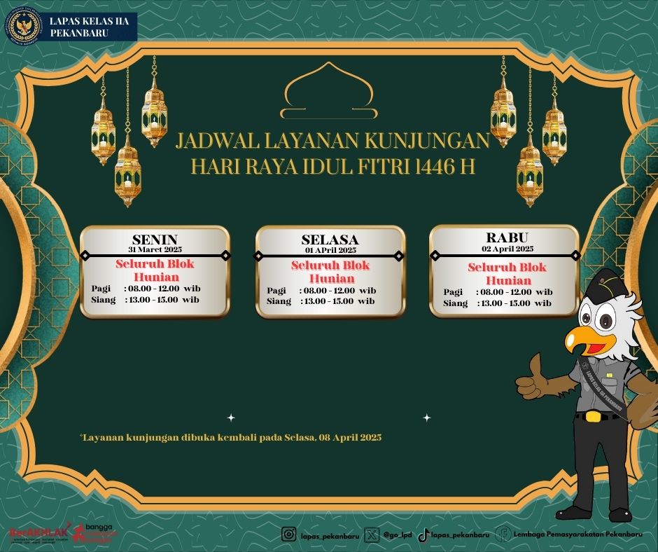 Pekanbaru, INFO_PAS – Lembaga Pemasyarakatan (Lapas) Kelas IIA Pekanbaru menggelar simulasi alur layanan kunjungan dalam rangka persiapan menyambut Hari Raya Idul Fitri 1446 H/2025 M, yang dipimpin langsung oleh Kepala Lapas Pekanbaru, Erwin Fransiskus Simangunsong, Sabtu (29/03). Menindaklanjuti arahan Direktur Jenderal Pemasyarakatan, Mashudi, pelaksanaan simulasi ini bertujuan untuk memastikan kelancaran serta keamanan layanan kunjungan bagi … Read more