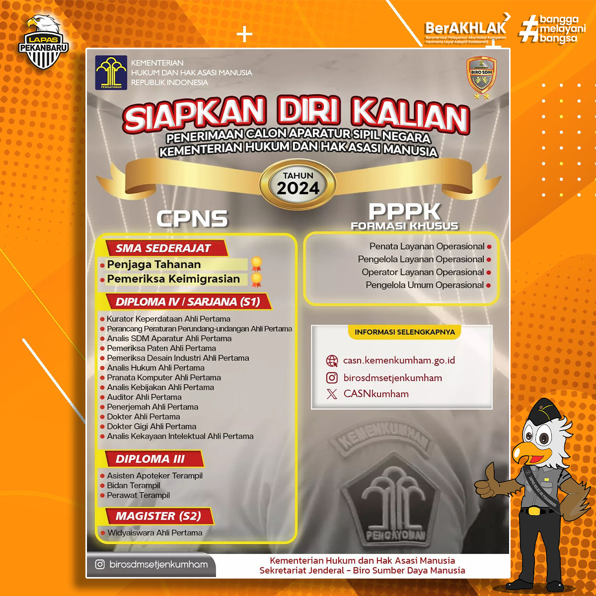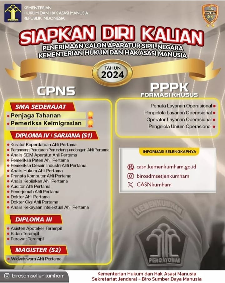 Putra-Putri terbaik Bangsa Indonesia, ayo bergabung bersama Kementerian Hukum dan Hak Asasi Manusia Republik Indonesia menjadi Calon Aparatur Sipil Negara Tahun 2024. Pantauan perkembangan informasi lebih lanjut melalui media resmi: Laman : Casn.kemenkumham.go.id SIAPKAN DIRI KALIAN! #CASNKemenkumham2024 #KemenkumhamRI #KamiPASTI