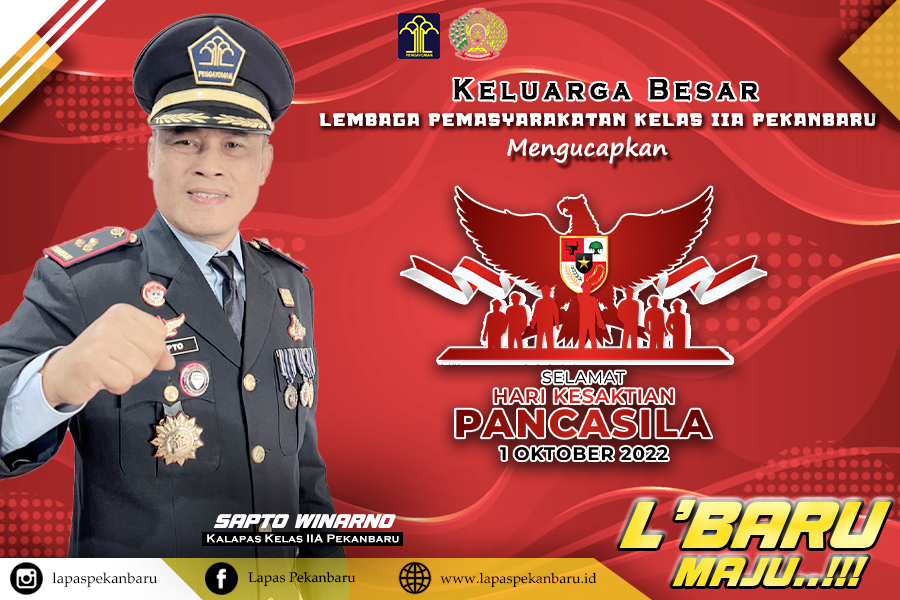Segenap Keluarga Besar Lembaga Pemasyarakatan Kelas IIA Pekanbaru mengucapkan SELAMAT MEMPERINGATI HARI KESAKTIAN PANCASILA – 01 OKTOBER 2022